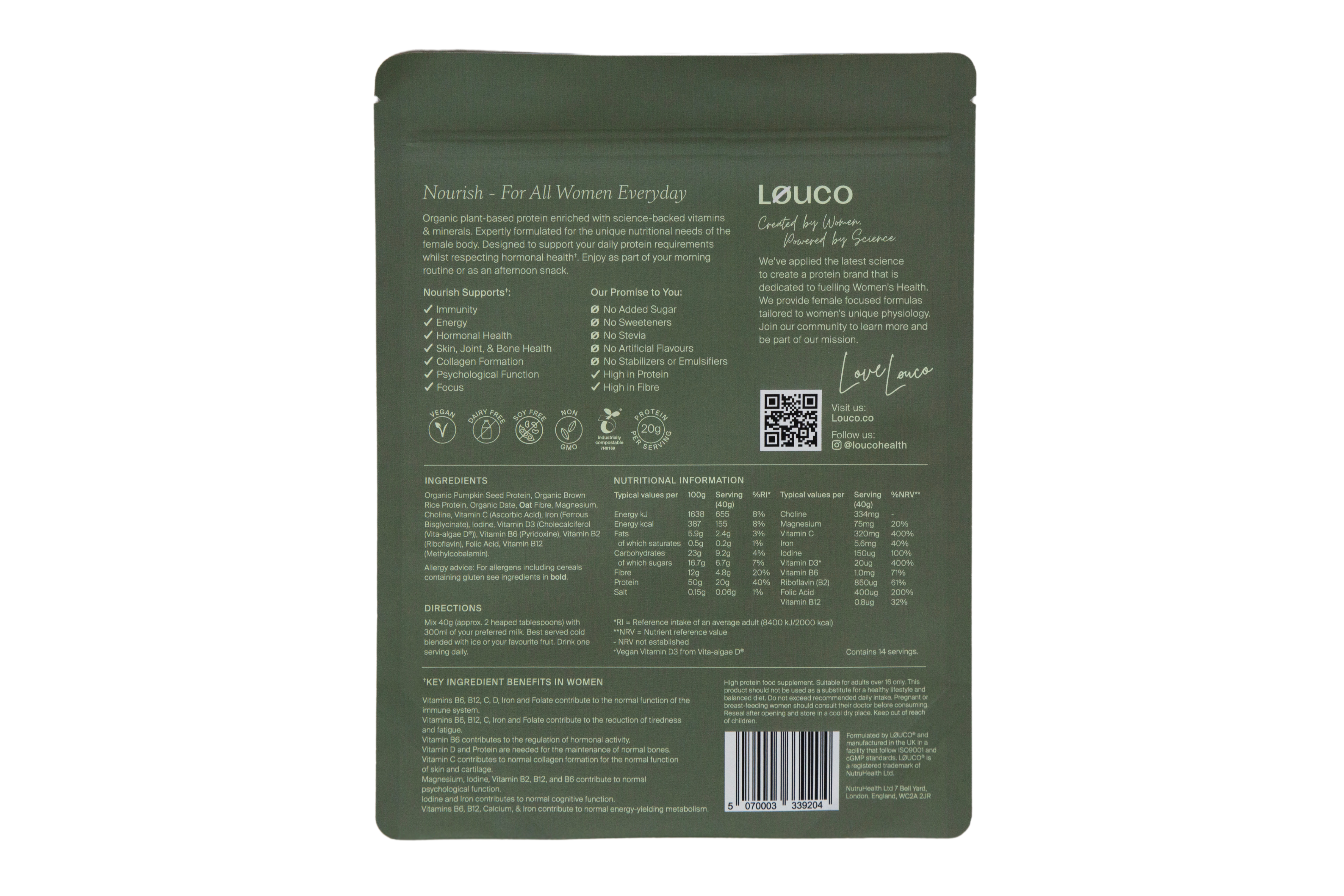 Nourish is your all-in-one daily solution, replacing the need for 11 supplements, high in fibre, and packed with 20g of organic plant-based protein.
